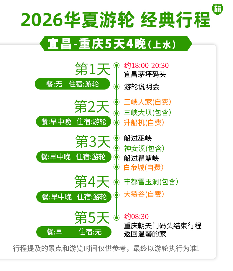 18:00-20:30 宜昌茅坪码头登船,可在宜昌市区乘坐“豪华游轮专用巴士”前往或自行前往码头登船